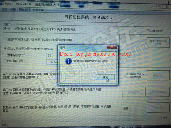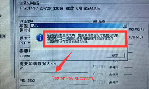 2)Then load in the data form 93C86 Chip,VVDI2 will display the key information include “ID” and “Key Number” and so on.Put a new key into the VVDI2 coil.Click to generate dealer key,the device will generate a new 93C86 file(save it),and it will remind you that”the dealer key generate successful”.