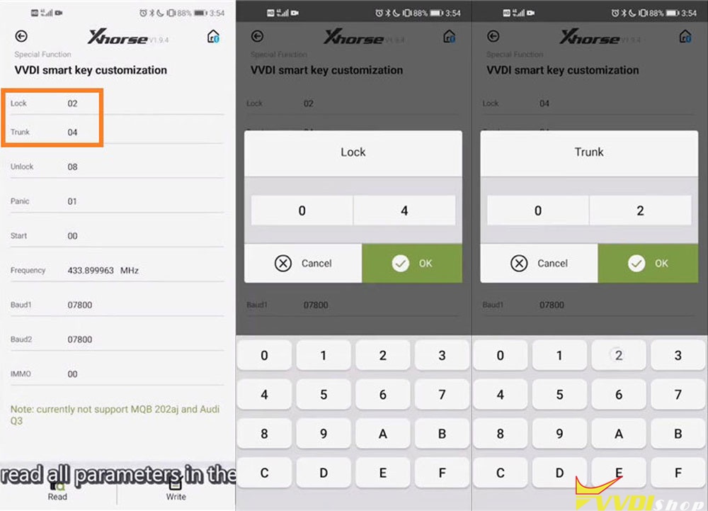 Smart key data will come out after press “Read”. If we found the “Lock” button is contrary to “Trunk” button, press them to correct the data.