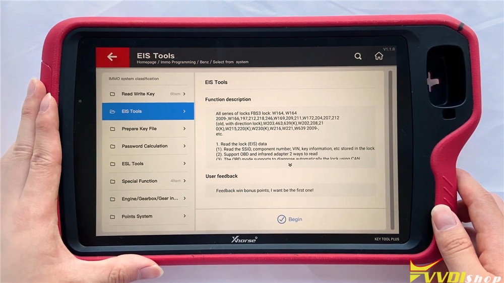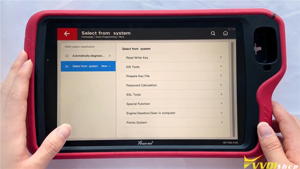 It enables Benz to read write key, use EIS tools, prepare key file, calculate password and do other functions. EIS tools maybe the most often to use, go into the function, we can select the type to perform or use auto detect(CAN) directly.