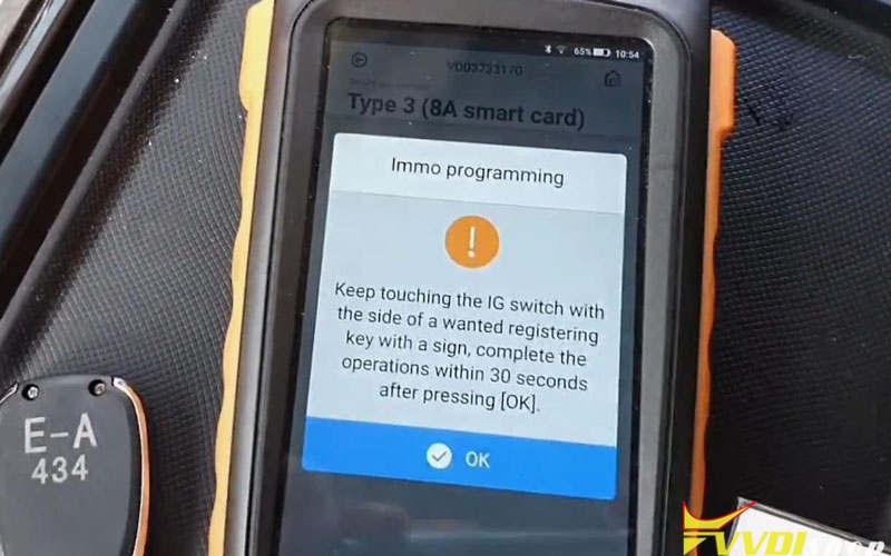 Keep touching the IG switch with the side of a working key with a sign, complete the operations within 30 seconds after pressing “OK”.