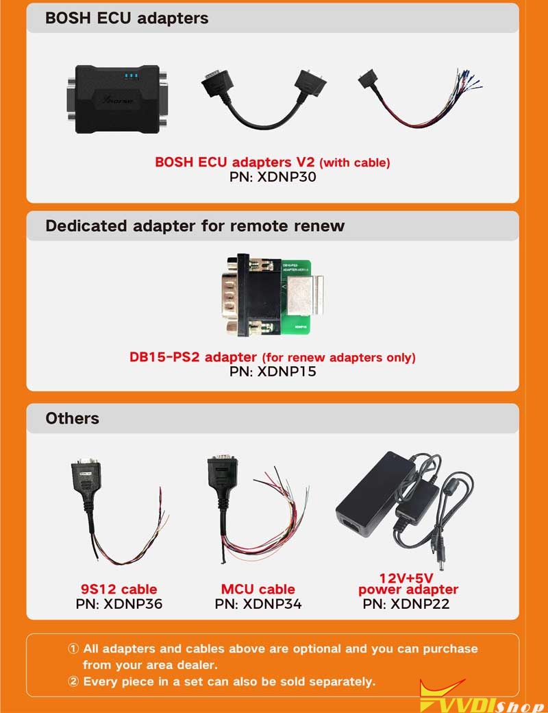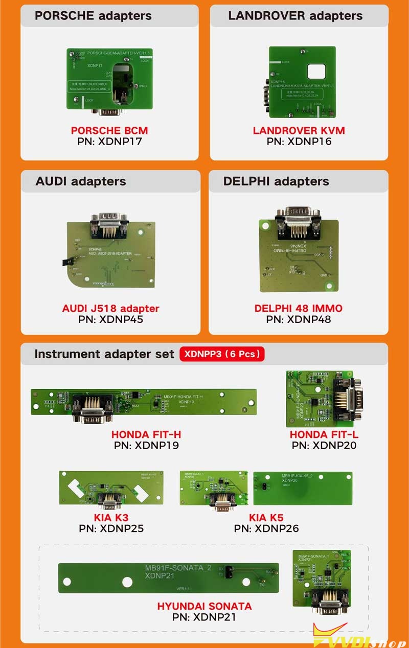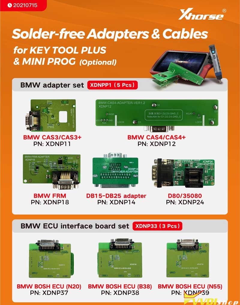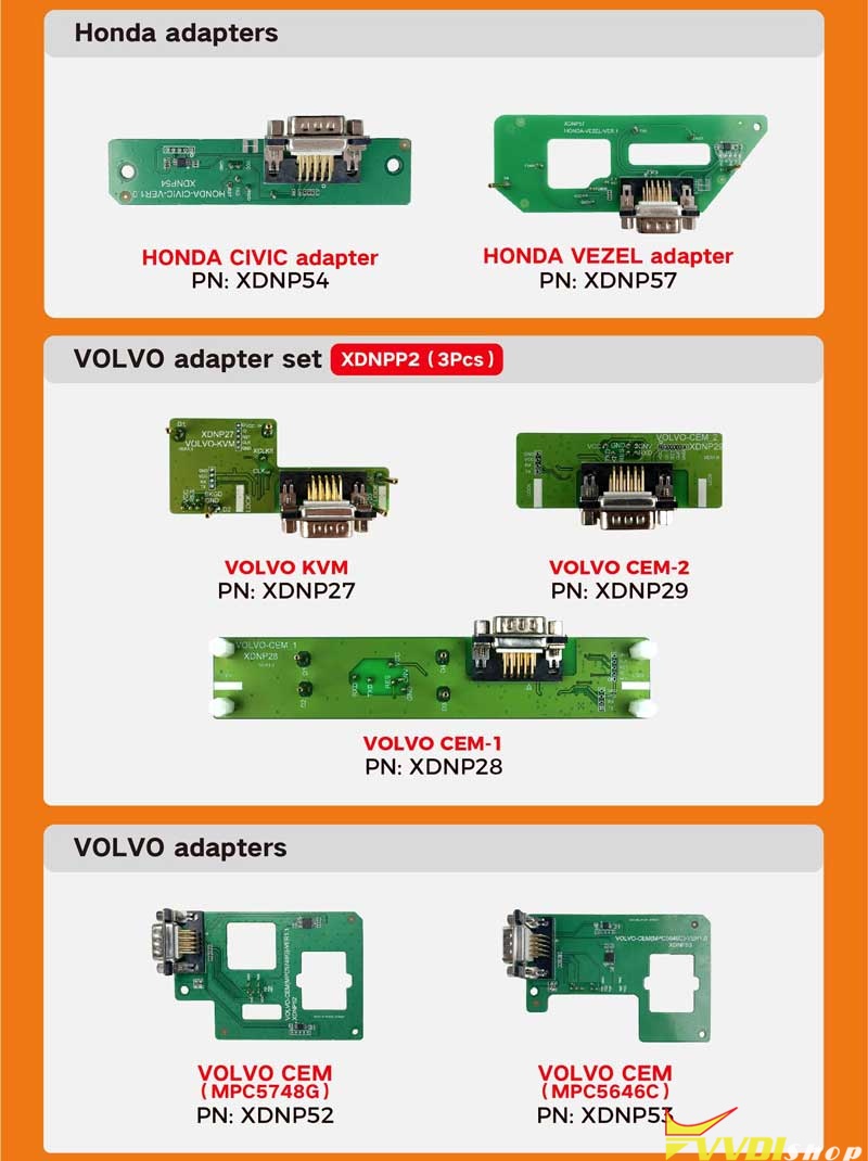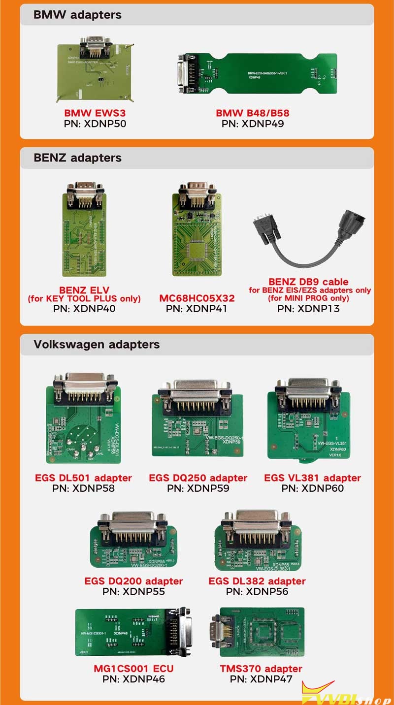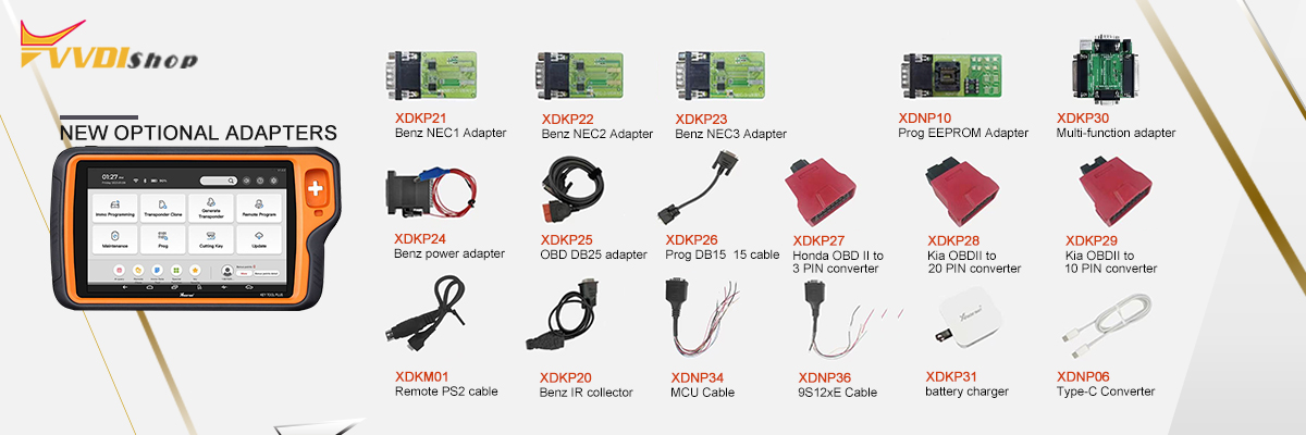 Xhorse has released nearly 100 adapters and cables that can apply to VVDI Key Tool Plus & Mini Prog. Covering BMW, Mercedes Benz, Volkswagen, Honda, Volvo, Porsche, Land Rover, Audi, Delphi for IMMO or ECU instruments.