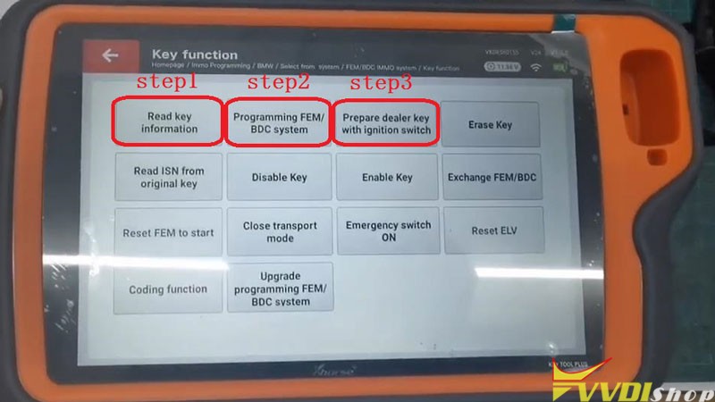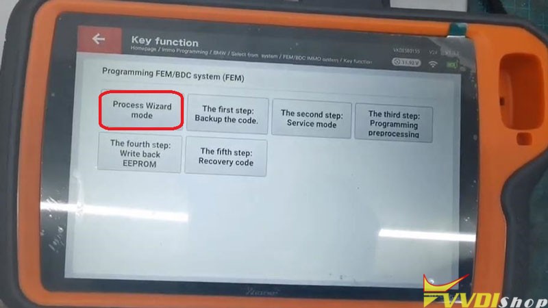 Immo programming >> Europe >> BMW >> Select from systems >> FEM/BDC IMMO system >> Key function >> Start programming >> Read key information >> Continue >> Continue >> Programming FEM/BDC system >> Process Wizard mode >> Begin