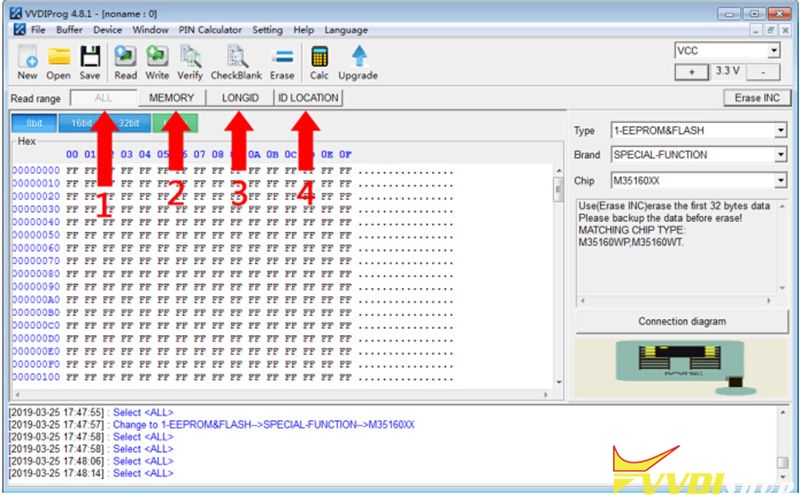 Perform “Erase INC” button(erasing the front 2 lines), select “ALL” or “MEMORY” option to read data for verify.