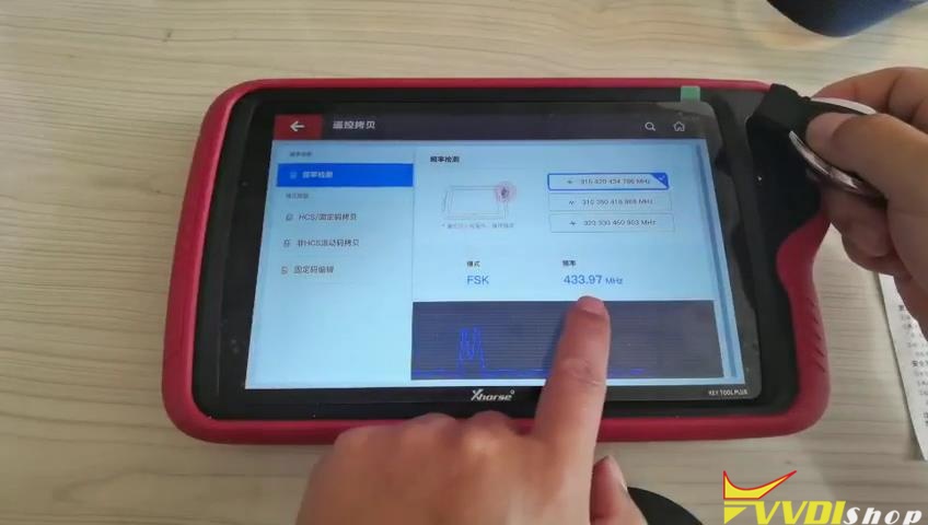 Go to “Frequency Detection” in “Remote Copy” function, hold the Benz smart key close to VVDI Key Tool Plus Pad slot, press Lock button to detect its frequency. It is a FSK 433.97 MHz smart key.