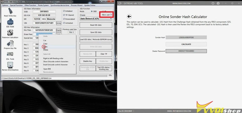 Step 3. Copy dealer password generated, paste it to VVDI MB BGA Tool “Erase Pass”, select “Allow user” option meanwhile.