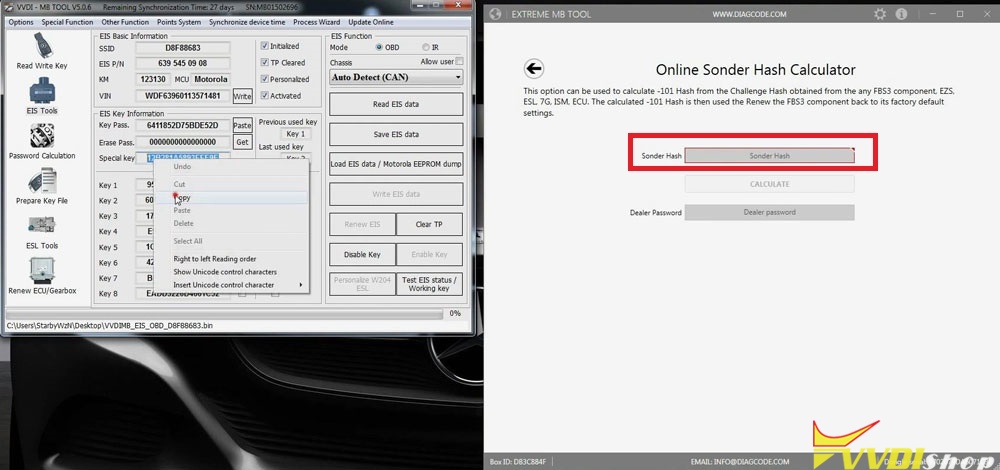 Step 2. Copy special key “12B281A5893FFE9E” on VVDI MB Tool and paste it to “Sonder Hash”, click “Calculate”.