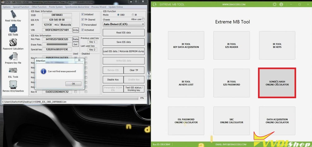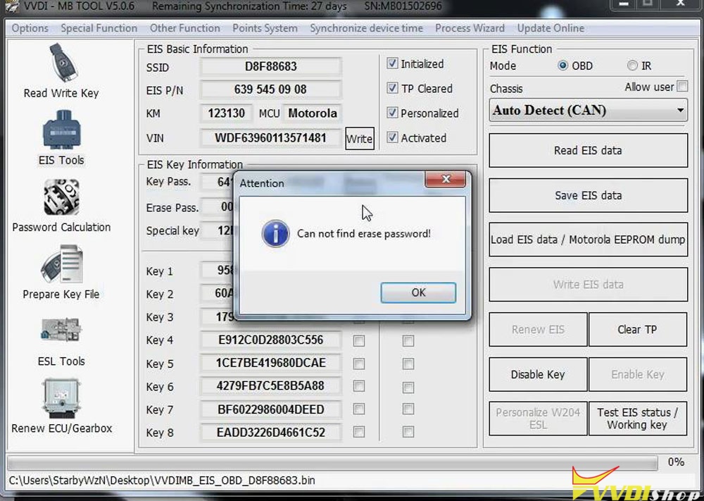 It tells “Can not find erase password!” when I am using Xhorse VVDI MB Tool to start and load W639 EIS data. What is the problem? Please help me!