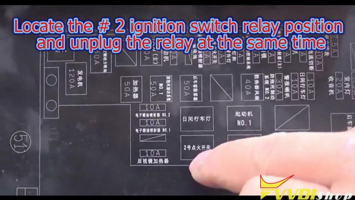 2) Locate the #2 ignition switch relay position and unplug the relay at the same time.