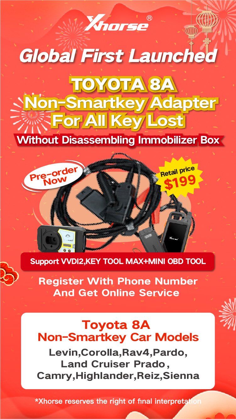 A: With this 8A AKL adapter, users can program Toyota 8A non-smart key ( on Levin, Corolla, RAV4, Parado, Land Cruiser, Camry, Highlander, Reiz, Sienna etc models) via OBD without disassembling immobilier box.
