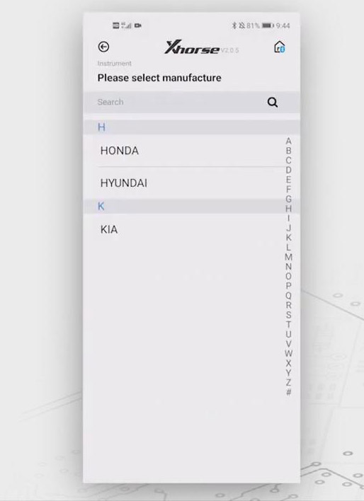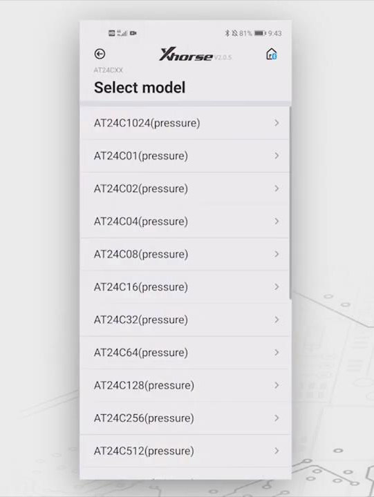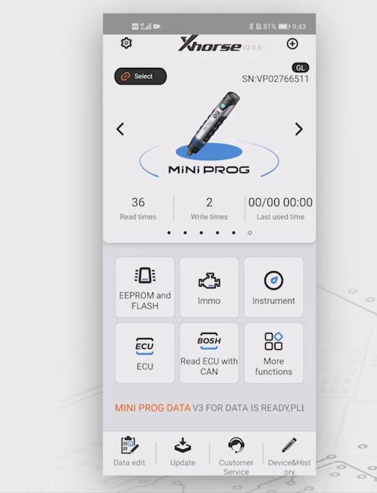 To operate Mini Prog, you have to download xhorse app on your smartphone, and access xhorse app, choose “MINI PROG” button, then click “select” >> “VP02766511”, and then choose the language you want.