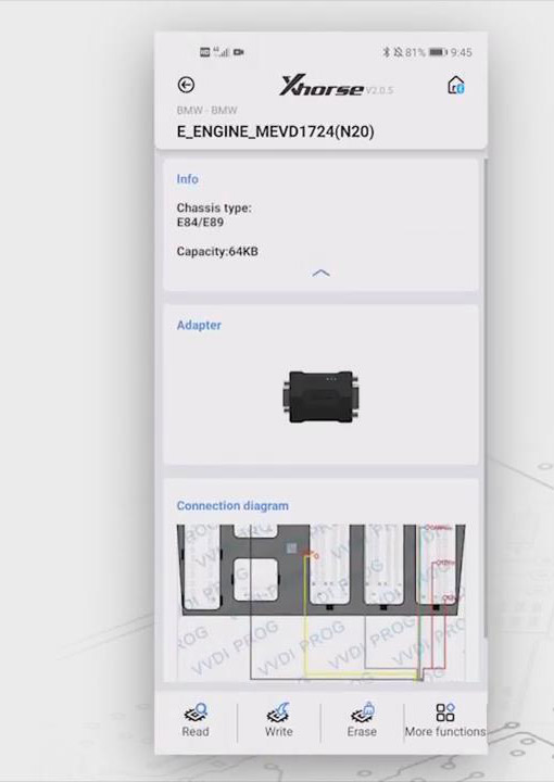 Let’s click “BMW”>>“BMW” again >>“E_ENGINE_MEVD1724(N20)”, then we can the info. of the adapter and the connection diagram.